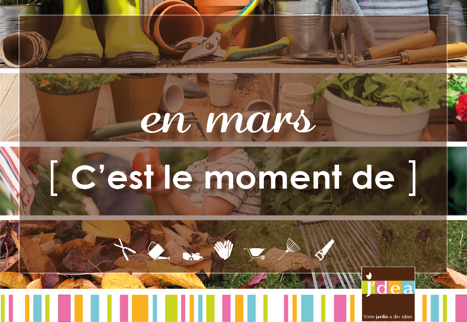 En mars, c’est le bon moment pour semer votre gazon et préparer votre potager. Grattez votre gazon qui a reçu, le mois dernier, un produit anti-mousse et a permis de retirer les résidus brûlés. Préparez votre sol pour vos futures plantations en l’ameublissant et enrichissez-le avec du fumier composté. C’est le moment de planter les pommes de terre et bulbes potagers. En extérieur, semez les carottes, choux, radis, salade et petits pois. Sous abris, semez les tomates et aubergines.