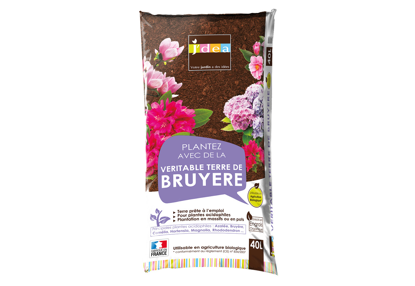 VERITABLE TERRE DE BRUYERE 40 L - J'DEA Fabriqué en France - Utilisable en Agriculture Biologique Terre prête à l'emploi Pour plantes acidophiles Plantation en massifs ou en pots
